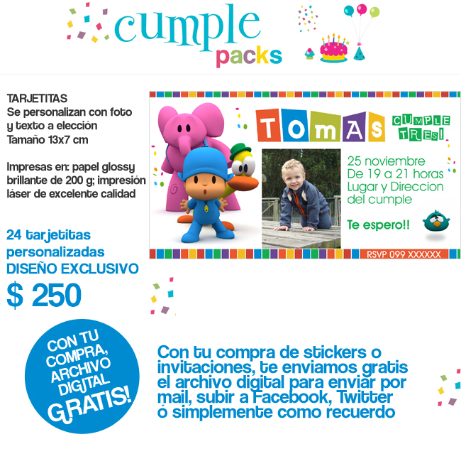 Cumple Packs Pocoyo Tarjetita Imane Sticker Y Cartel